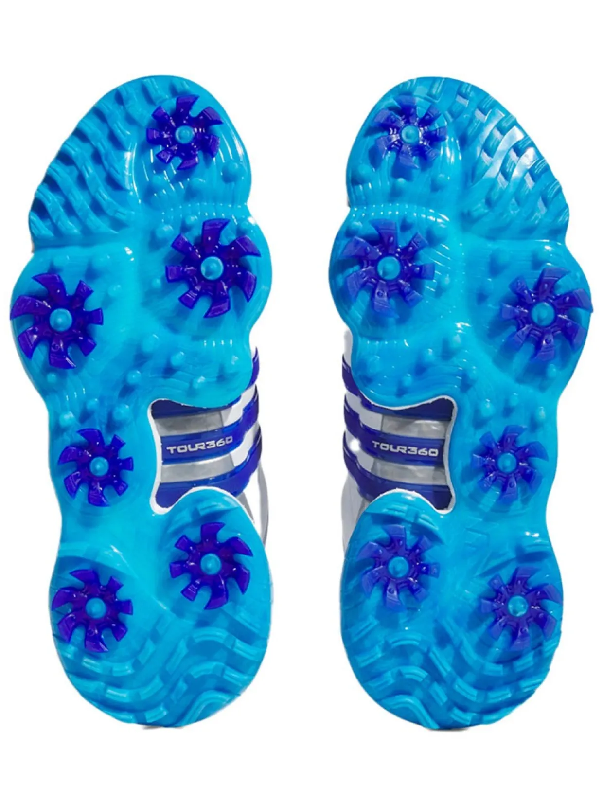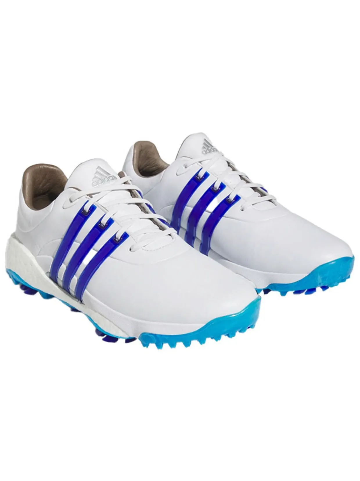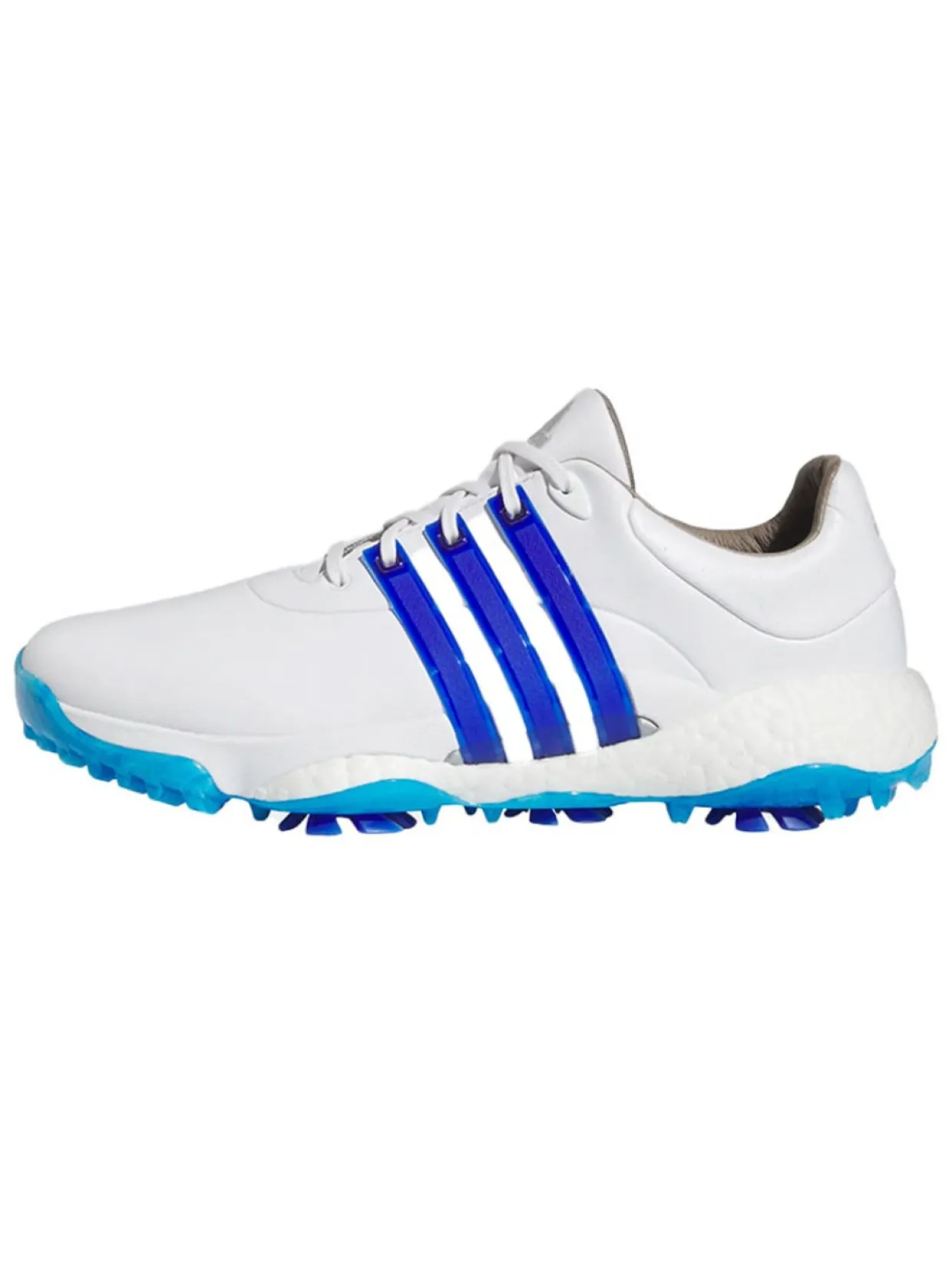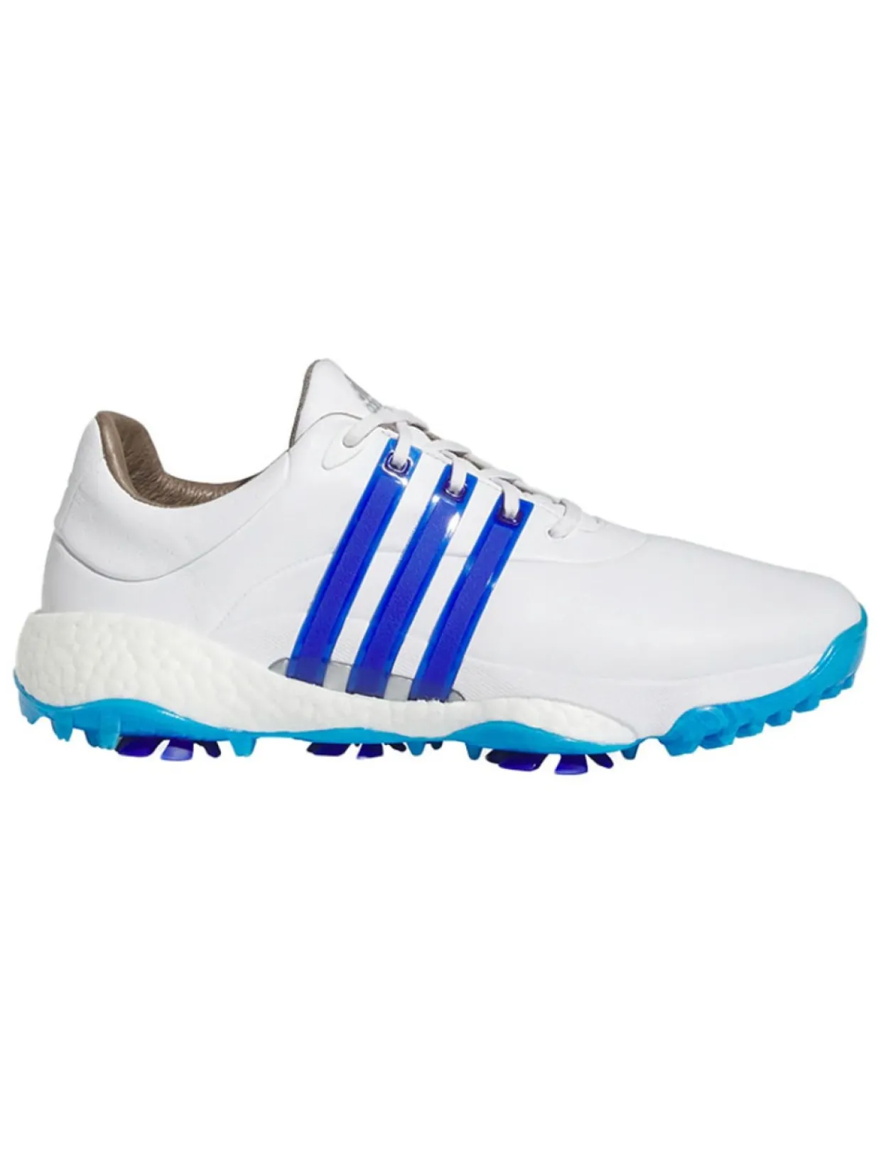 Adidas Tour360 22 Golf Shoes (White/Lucid Blue) Are Made With A Boost Midsole For Energy Return And Enhanced Comfort. The 360Wrap Design Locks In And Supports Your Feet Through 18 Holes And Beyond. An Insite Sockliner Offers Cushioning For Optimal Fit And Balance, And The Spikemore Traction Outsole Provides Solid Grip Throughout Your Entire Round.